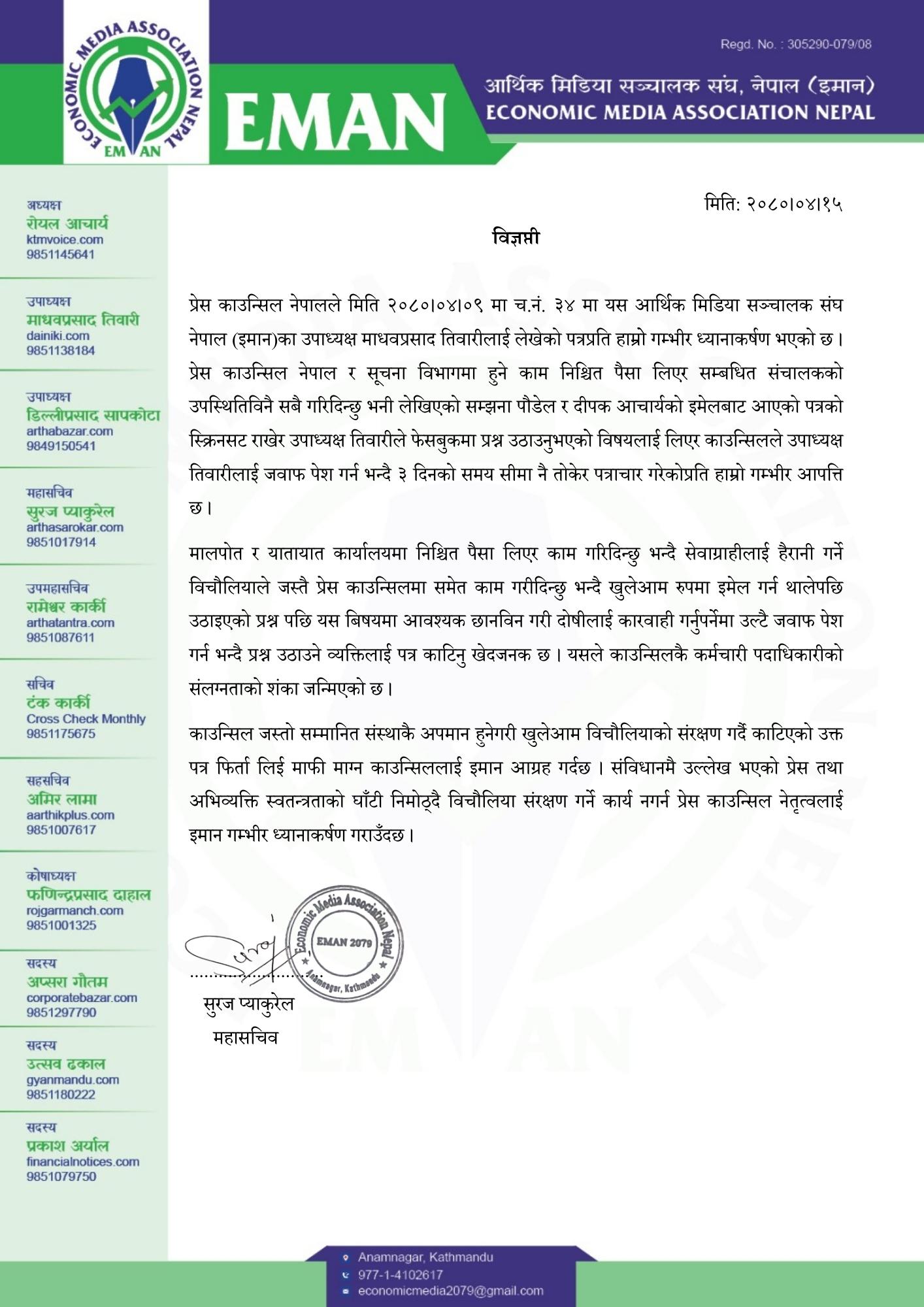 सोमवार महासचिव सुरज प्याकुरेलले विज्ञप्ती मार्फत इमानले प्रेस काउन्सिल नेपाल र सूचना विभागमा हुने काम निश्चित पैसा लिएर सम्बधित सञ्चालकको उपस्थितिविनै सबै गरिदिन्छु भनी लेखिएको सम्झना पौडेल र दीपक आचार्यको इमेलबाट आएको पत्रको स्क्रिनसट राखेर उपाध्यक्ष तिवारीले फेसबुकमा प्रश्न उठाएको विषयलाई लिएर काउन्सिलले जवाफ पेश गर्न भन्दै ३ दिनको समय सीमा नै तोकेर पत्राचार गरेकोप्रति गम्भीर आपत्ति जनाएको हो ।