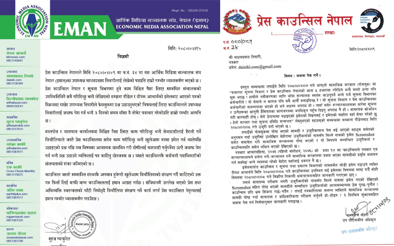 सोमवार महासचिव सुरज प्याकुरेलले विज्ञप्ती मार्फत इमानले प्रेस काउन्सिल नेपाल र सूचना विभागमा हुने काम निश्चित पैसा लिएर सम्बधित सञ्चालकको उपस्थितिविनै सबै गरिदिन्छु भनी लेखिएको सम्झना पौडेल र दीपक आचार्यको इमेलबाट आएको पत्रको स्क्रिनसट राखेर उपाध्यक्ष तिवारीले फेसबुकमा प्रश्न उठाएको विषयलाई लिएर काउन्सिलले जवाफ पेश गर्न भन्दै ३ दिनको समय सीमा नै तोकेर पत्राचार गरेकोप्रति गम्भीर आपत्ति जनाएको हो ।