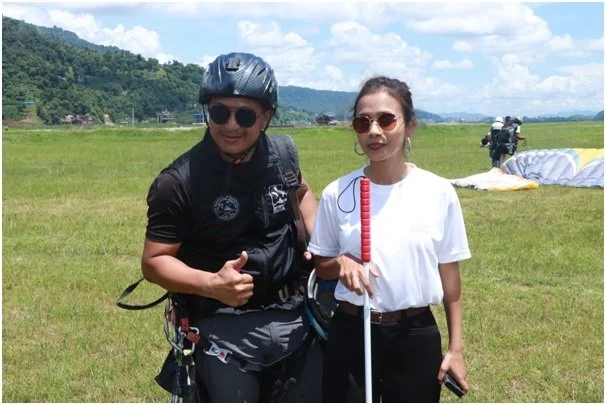 शारीरिकरूपमा दृष्टिविहीन सुनिता त्रिभुवन अन्तर्राष्ट्रिय विमानस्थलमा टेलिफोन ‘अपरेटर’को काम गर्छिन् । ‘ब्लाइन्ड रक’ संस्थाको सदस्यसमेत रहेकी उनी प्याराग्लाइडिङको अनुभवका लागि आइतबार दिउँसो पोखरा आएकी थिइन् ।