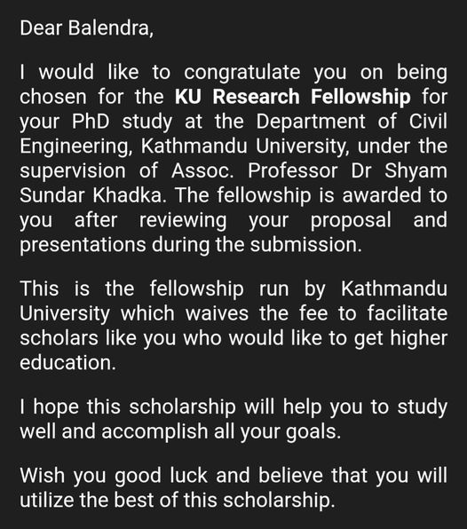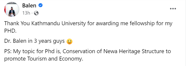 काठमाडौं विश्वविद्यालयले फेलोसिप दिएको जानकारी उनले आफ्नो सामाजिक संजाल फेसबुकमार्फत गराए ।