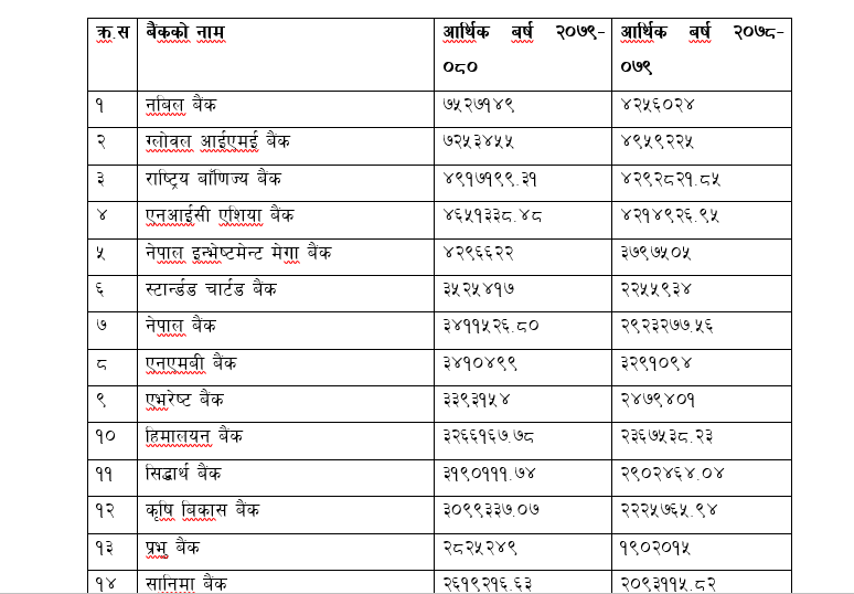 अघिल्लो आवमा भने यि बैंकहरुको यस्तो नाफा क्रमश : चार अर्ब २९ करो २८ लाख २१ हजार, चार अर्ब २१ करोड ४९ लाख २६ हजार र तीन अर्ब ७९ करोड ७५ लाख पाँच हजार रुपैंयाँ रहेको थियो ।