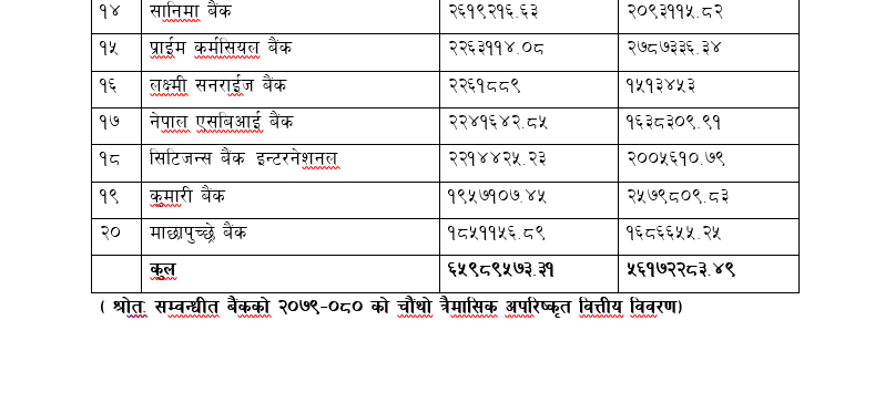अपरिष्कृत वित्तीय विवरण अनुसार आवमा सबै भन्दा बढी नाफा नबिल बैंकले कमाएको छ भने सबैभन्दा कम नाफा माद्धापुच्छे« बैंकले कमाएको छ । नबिलले कुल सात अर्ब ५२ करोड ७१ लाख ४९ हजार रुपैंयाँ खुद मुनाफा कमाउँदा माछापुच्छे« बैंकले एक अर्ब ८५ करोड ११ लाख ५६ हजार रुपैयाँ खुद मुनाफा कमाएको थियो ।