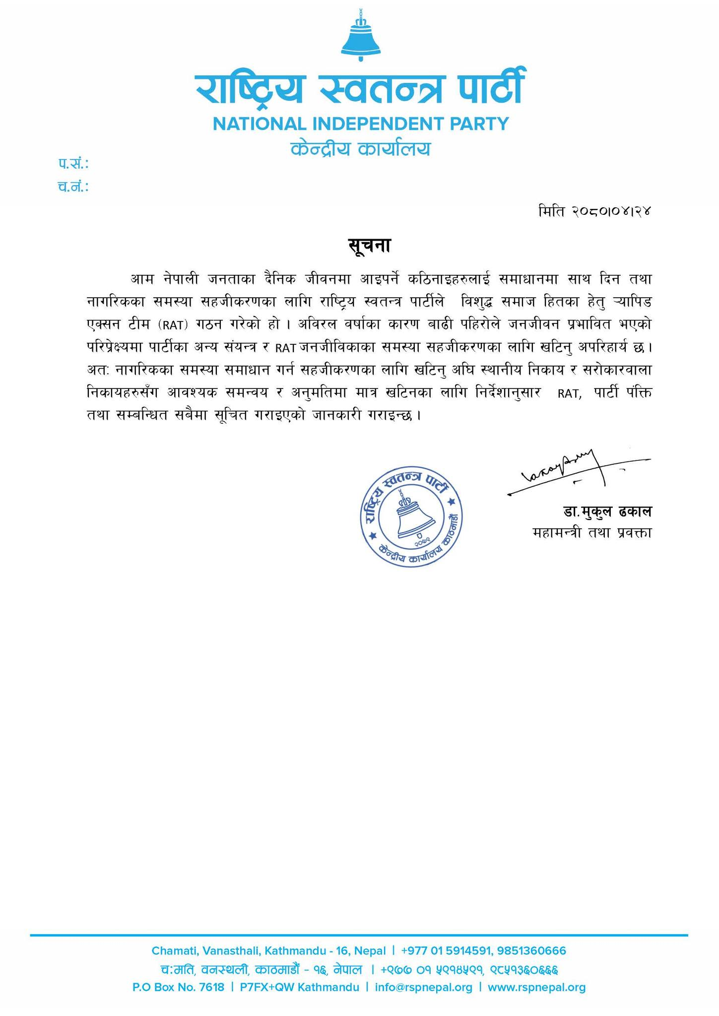 ‘अविरल वर्षाका कारण बाढी पहिरोले जनजीवन प्रभावित भएको परिप्रेक्ष्यमा पार्टीका अन्य संयन्त्र र आरएटी जनजीविकाका समस्या सहजीकरणका लागि खटिनुु अभिवार्य छ । अतः नागरिकका स मस्या समाधान गर्न सहजीकणका लागि खटिनुुअघि स्थानीय निकाय र सरोकारवाला निकायहरुसँग आवश्यक समन्वय र अनुुमतिमा मात्र खटिनका लागि निर्देशनअनुसार आरएटी र पार्टी पंक्ति तथा सम्बन्धित सबैमा सूचित गराइएको जानकारी गराइन्छ ।’ जारी विज्ञप्तिमा भनिएको छ ।
