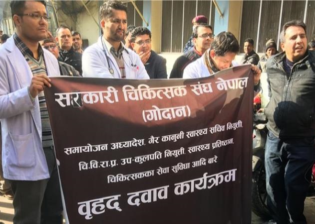 सरकारले ल्याएको कर्मचारी समायोजन विधेयकविरुद्ध आन्दोलनरत सरकारी चिकित्सक संघ, नेपाल(गोदान)ले सामूहिक राजीनामा दिने र सशक्त आन्दोलनको कार्यक्रम घोषणा गरेको हुन् ।