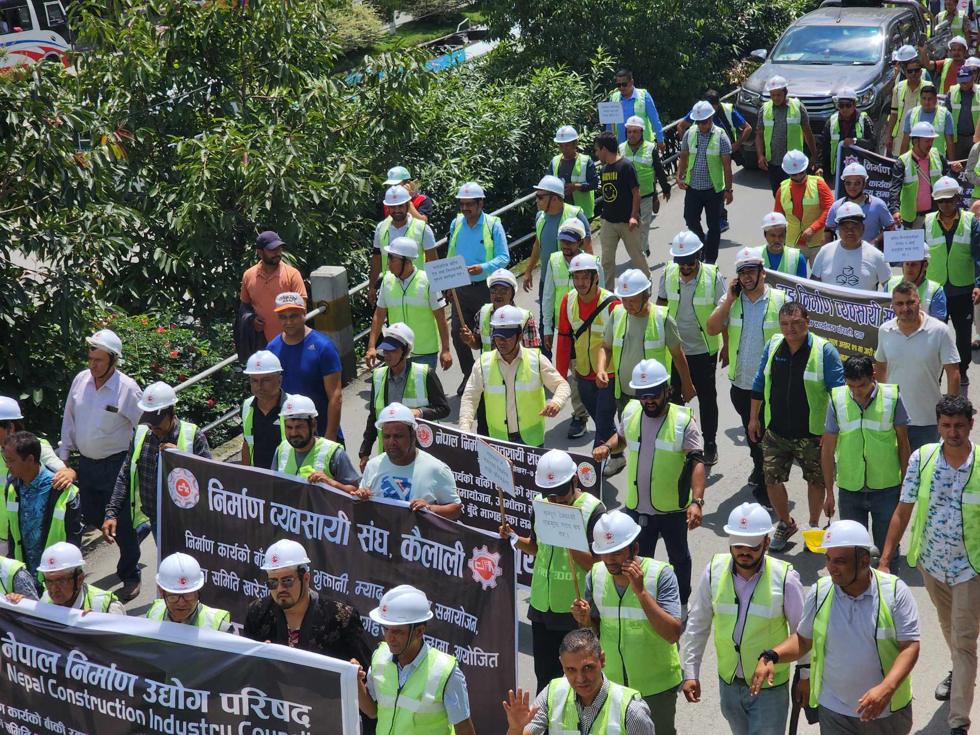 काठमाडौं । नेपाल निर्माण व्यवसायी महासंघको दोस्रो चरणको आन्दोलन विहिवार पनि जारी रह्यो । विहिवार राजधानीमा देशभरका निर्माण व्यवसायीहरूले सेफ्टी हेल्मेट र ज्याकेट लगाई हातमा कालो पट्टी बाँधेर सिठ्ठी जुलुश गरेका छन् ।