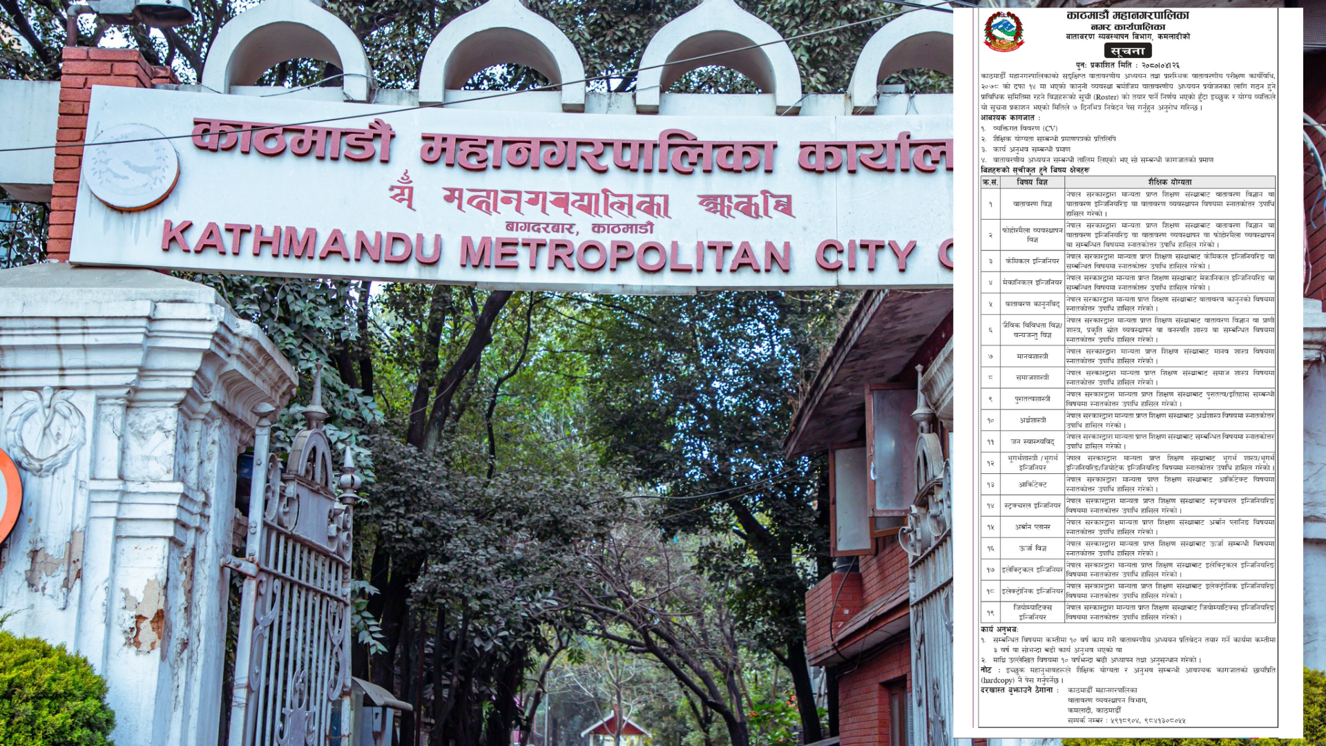 काठमाडौं । काठमाडौं महानगरपालिकाले विभिन्न १९ विषय विज्ञ पदका लागि आवदेन आह्वान गरेको छ । महानगरले शुक्रबार सार्वजनिक सूचनामार्फत विभिन्न विषय विज्ञका लागि पर्याप्त आवेदन नपरेपछि उसले पुनः सूचना निकालेको हो ।