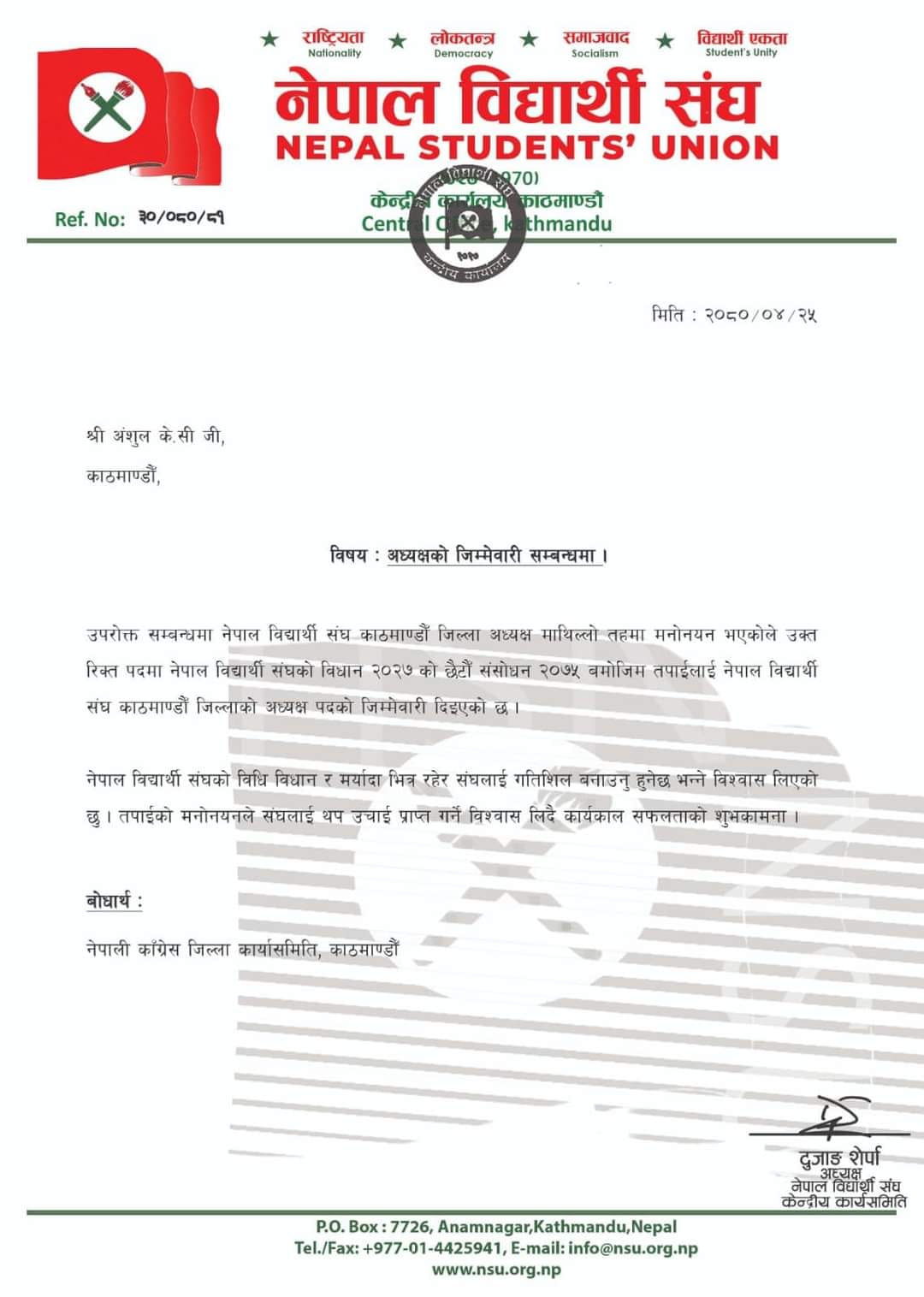 काठमाडौं । नेपाली कांग्रेसको भातृ संगठन नेपाल विद्यार्थी संघ (नेविसंघ) को काठमाडौंको अध्यक्षको जिम्मेवारी अंशुुल केसीलाई दिइएको छ ।