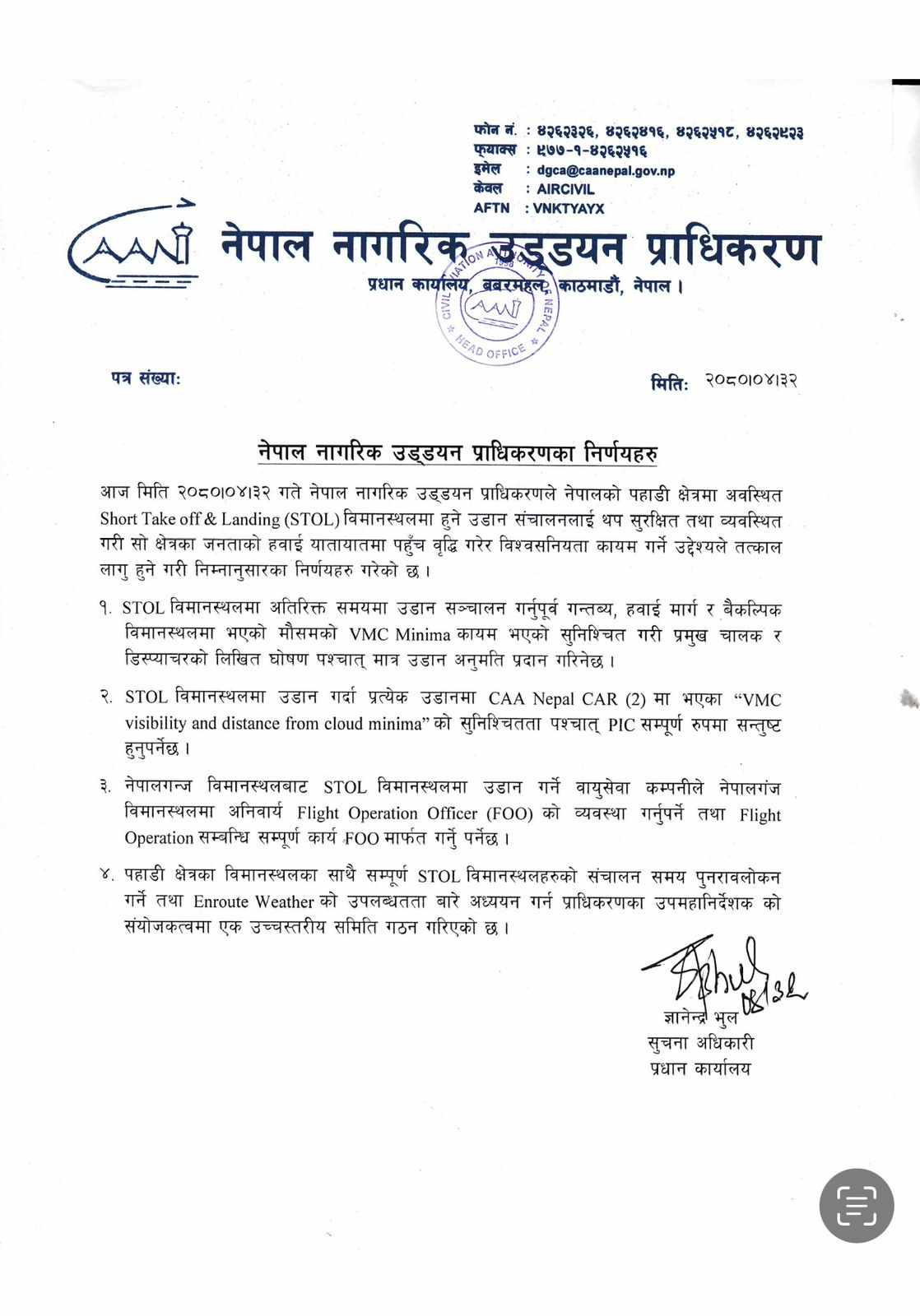 त्यस्तै पहाडी क्षेत्रका विमानस्थलका साथै सम्पूूर्ण स्टोल विमानस्थलहरुको संचालन समय पुनरावलोकन गर्ने तथा Enroute weather को उपलब्धताबारे अध्ययन गर्ने प्राधिकरणका उपमहानिर्देशकको संयोजकत्वमा एक उच्चस्तरीय समिति समेत गठन गरिएको जानकारी दिइएको छ ।