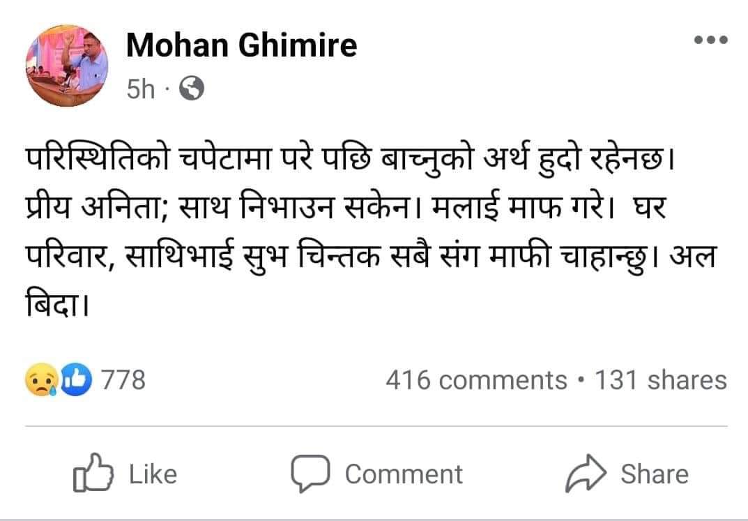 घिमिरेले ‘परिस्थितिको चपेटामा परे पछि बाच्नुको अर्थ हुँदो रहेनछ। प्रिय अनितास् साथ निभाउन सकेन । मलाई माफ गरे। घर परिवार, साथीभाइ सुभ चिन्तक सबैसँग माफी चाहन्छु । अलबिदा ।’ भन्दै फेसबुकमा लेखेका थिए ।