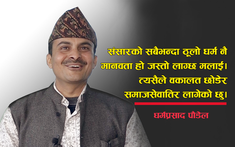 ललितपुर । स्थायी जागिर, मिलेको परिवार, सुविधासम्पन्न जीवन । औसत व्यक्तिले चाहने कुरा यही न हुन् । जीवनभरि ऊ भाग्ने, दगुर्ने, हतारो चटारोमा देखिने भनेको यही तत्व प्राप्तिका लागि हो । तर, आफ्नो स्थिर पेशा र व्यक्तिगत सुखसुविधालाई त्यागेर समाजसेवामा समर्पित भएका धर्मप्रसाद पौडेलको जीवनकथा भने छुट्टै छ ।