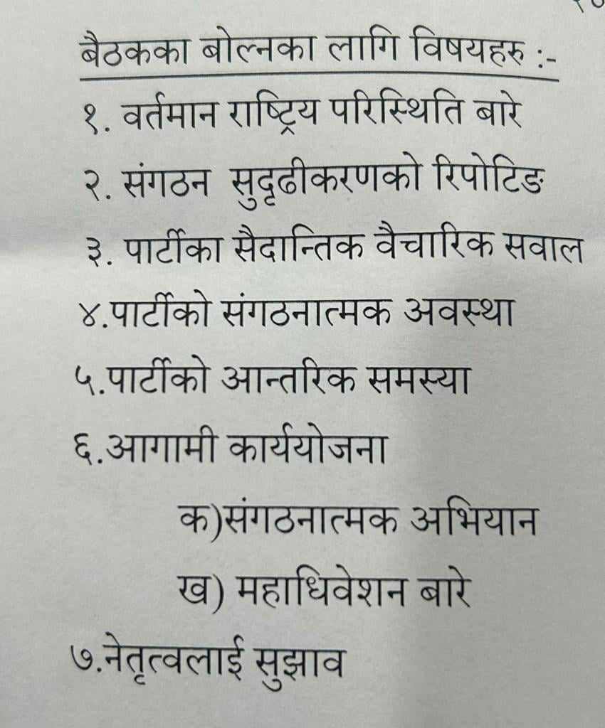 जसमा वर्तमान राष्ट्रिय परिस्थिति, संगठन सुुदृढीकरणको रिपोटिङ, पार्टीको शैद्धान्तिक वैचारिक सवाल, पार्टीको संगठनात्मक अवस्था, पार्टीको आन्तरिक समस्या रहेका छन् । त्यस्तै आगामी कार्ययोजना जसमा संगठनात्मक अभियान र महाधिवेशन रहेको छ भने नेतृत्वलाई सुुझाव समेत बोल्ने विषयमा राखिएको छ ।