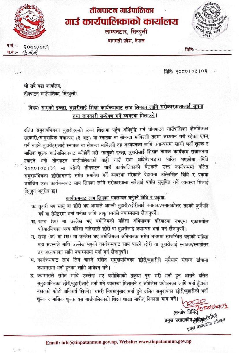 सिन्धुली । जिल्लाको तीनपाटन गाउँपालिकाले दलीत समुदायका छोरी र बुहारीहरुलाई स्नातक र स्नातकोत्तरसम्मको शिक्षा निशुल्क प्रदान गर्ने भएको छ ।