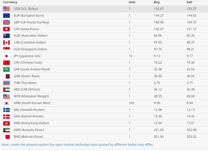नेपाल राष्ट्र बैंकले सोमबारका लागि विदेशी मुद्राको विनिमयदर निर्धारण गरेको छ । जसअनुसार अमेरिकी डलर एकको खरिददर १३२ रुपैयाँ ६७ पैसा र बिक्रीदर १३३ रुपैयाँ २७ पैसा तोकिएको छ ।