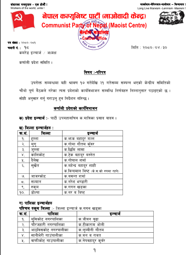 मओवादी केन्द्रको साउन (१७–२१)सम्म बसेको केन्द्रीय समितिको निर्णय बमोजिम अन्तरजिल्ला हेर्ने गरी केन्द्रीय सदस्यहरूको जिम्मेवारी हेरफेर गरिएको हो । कर्णालीमा माओवादीले प्रदेशभित्रका सबै नगरपालिका र गाउँपालिका हेर्ने गरि जिम्मेवारीसमेत तोकेको छ ।
