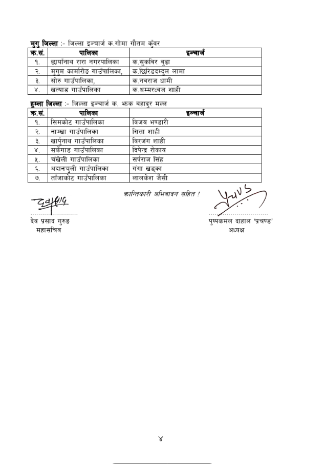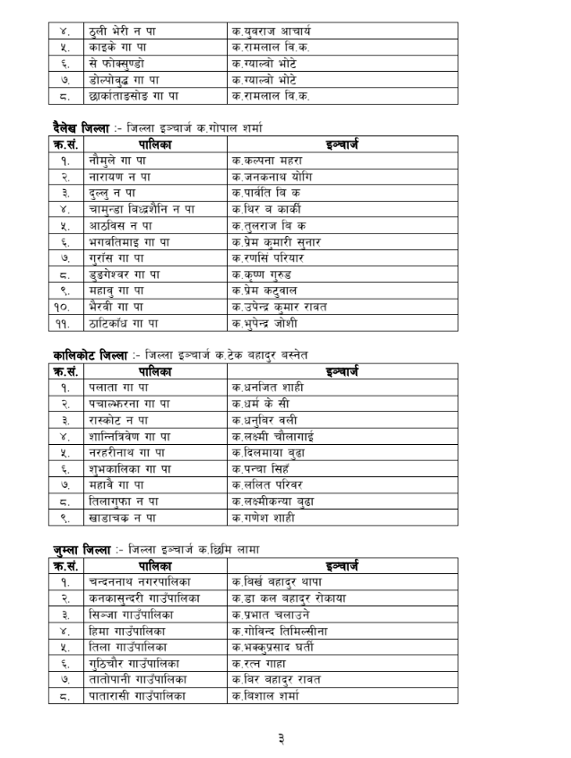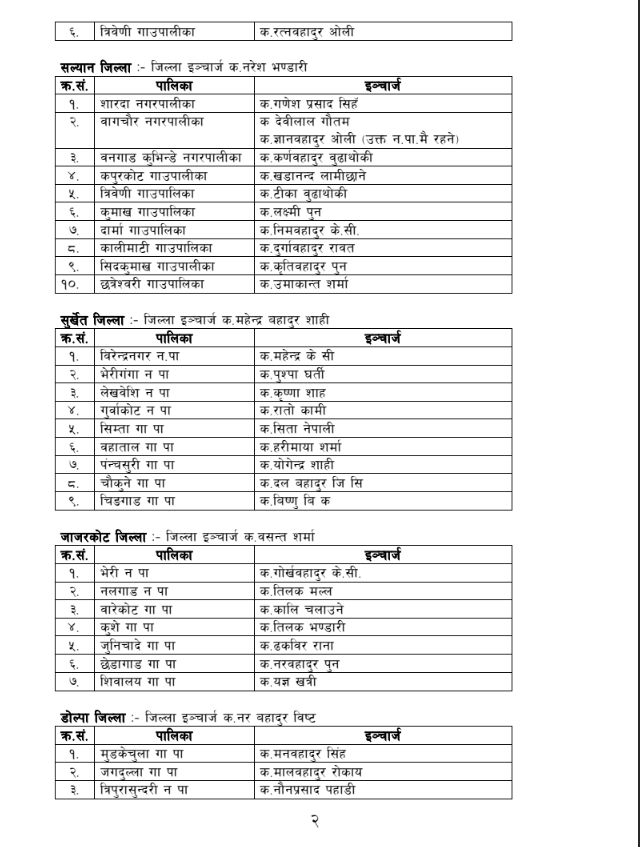 त्यस्तै जाजरकोटमा बसन्त शर्मा, रुकुममा गगन खड्का,सल्यानमा नरेश भण्डारी, र डोल्पामा नरबहादुर बिष्ट इन्चार्ज तोकिएका छन् ।