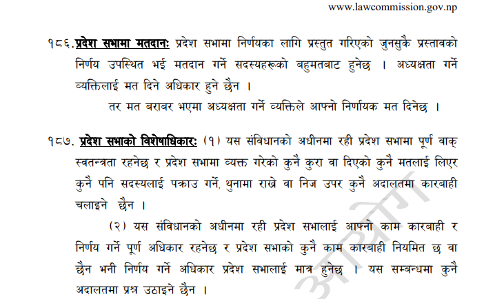 प्रदेशसभामा निर्णयका लागि प्रस्तुत गरिएको जुनसुकै प्रस्तावको निर्णय उपस्थित भई मतदान गर्ने सदस्यहरूको बहुमतबाट हुनेछ । अध्यक्षता गर्ने व्यक्तिलाई मत दिने अधिकार हुने छैन । तर, मत बराबर भएमा अध्यक्षता गर्ने व्यक्तिले आफ्नो निर्णायक मत दिनेछ । संविधानमा लेखिएको छ ।