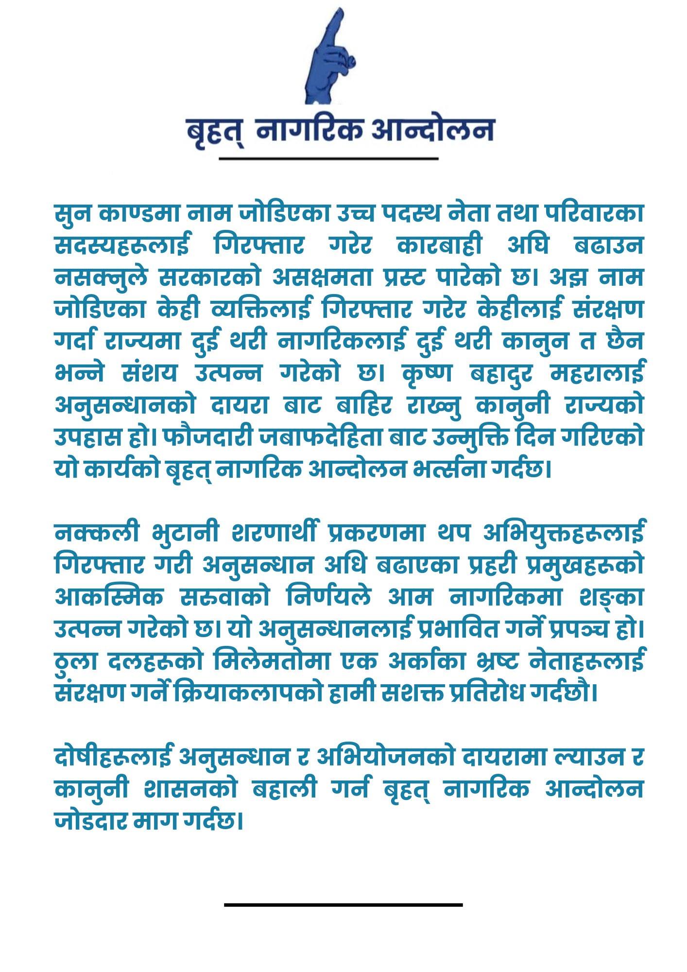 ‘सुन प्रकरणमा नाम जोडिएका उच्च पदस्थ नेता तथा परिवारका सदस्यहरुलाई गिरफ्तार गरेर कारबाही अघि बढाउन नसक्नुुले सरकारको असक्षमता प्रष्ट पारेका छ । अझ नाम जोडिएका केही व्यक्तिलाई गिरफ्तार गरेर केहीलाई संरक्षण गर्दा राज्य दुुईथरी नागरिकलाई दुईथरी कानुन त छैन भन्ने संशय उत्पन्न गरेको छ ।’ जारी विज्ञप्तिमा भनिएको छ, ‘कृष्णबहादुर महरालाई अनुसन्धानको दायराबाट बाहिर राख्नु कानुनी राज्यको उपहास हो । फौजदारी जवाफदेहिताबाट उन्मुक्ति दिन गरिएको यो आन्दोलनको बृहत नागरिक आन्दोलन भर्त्सना गर्दछ ।’