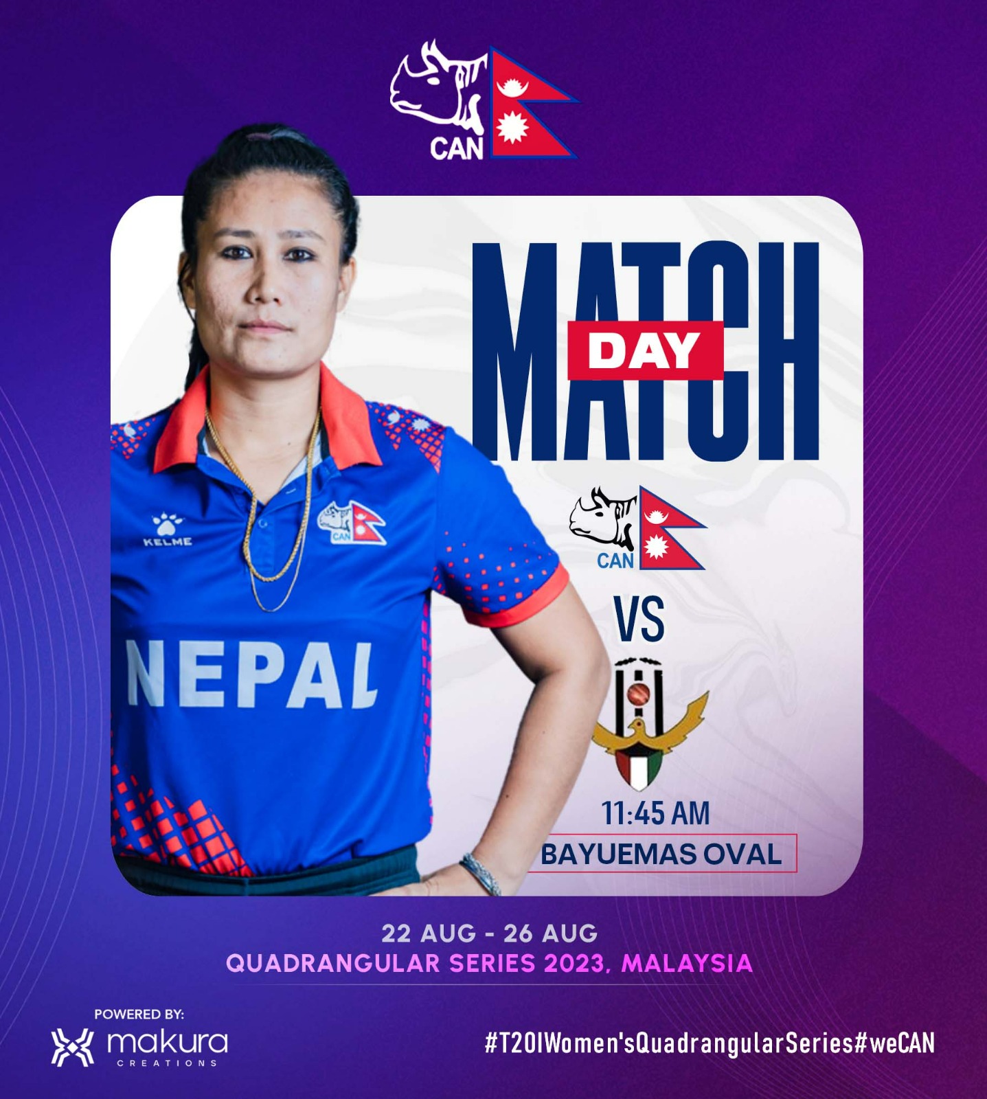 काठमाडौं । मलेसियामा जारी महिला टि ट्वेन्टी क्रिकेट श्रृंखलाको दोस्रो खेलमा नेपालले आज कुवेतसँग प्रतिश्पर्धा गर्दैछ । पहिलो खेलमा मंगलबार हङकङलाई ६ विकेटले हराएको नेपाल आज बुधबार कुवेतसँग खेल्न लागेको हो ।