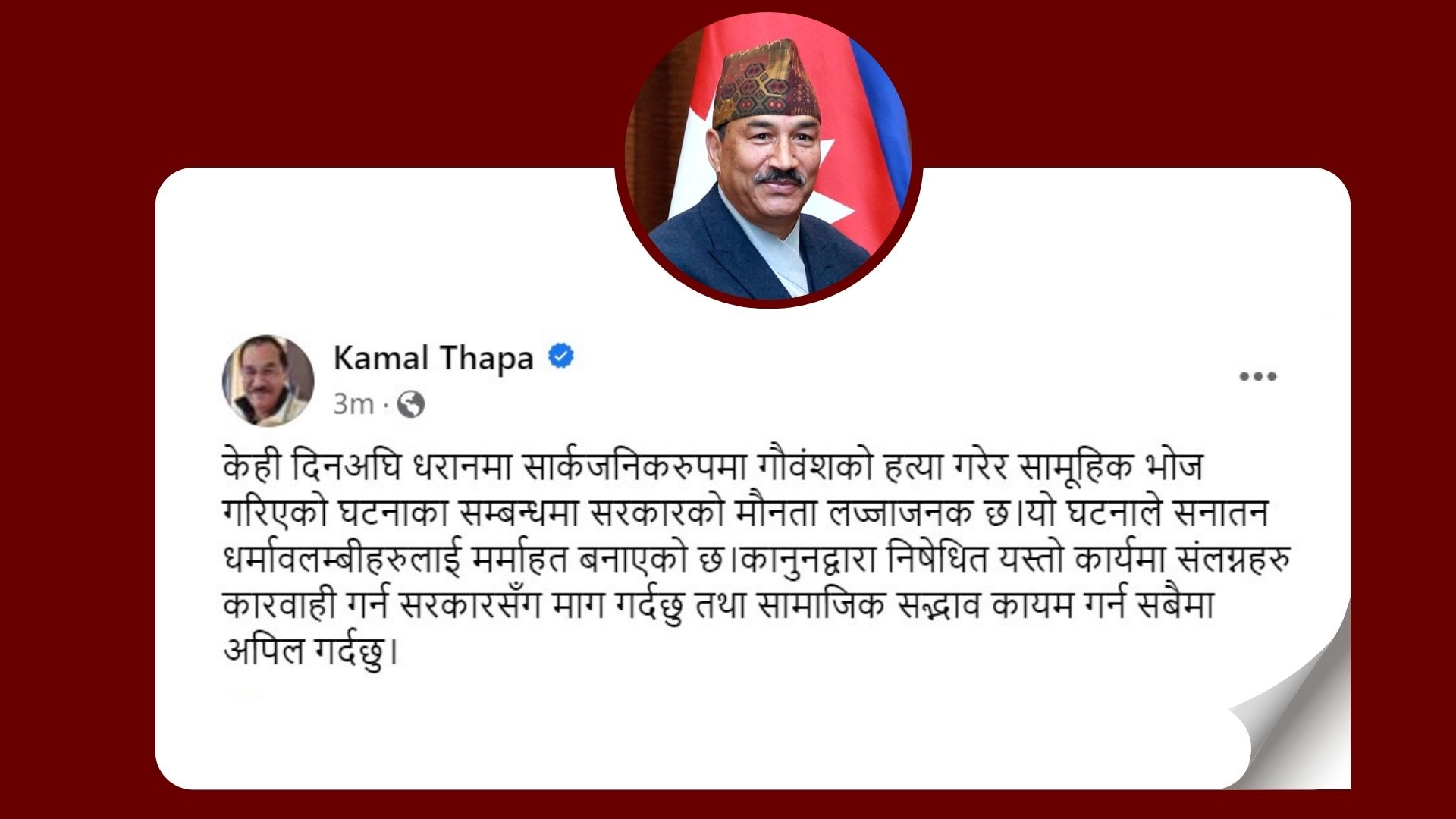‘केही दिनअघि धरानमा सार्वजनिकरुपमा गौवंशको हत्या गरेर सामूहिक भोज गरिएको घटनाका सम्बन्धमा सरकारको मौनता लज्जाजनक छ । यो घटनाले सनातन धर्मावलम्बीहरुलाई मर्माहत बनाएको छ । कानुनद्वारा निषेधित यस्तो कार्यमा संलग्नहरु कारवाही गर्न सरकारसँग माग गर्दछु तथा सामाजिक सद्भाव कायम गर्न सबैमा अपिल गर्दछु ।’ उनले सामाजिक सञ्जालमा लेखेका छन् ।