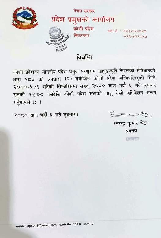 प्रदेश प्रमुखको कार्यालयका प्रवक्ता नरेन्द्रकुमार श्रेष्ठका अनुसार संविधानको धारा १८३ को उपधारा २ बमोजिम कोशी प्रदेश मन्त्रिपरिषद्को सिफारिसमा प्रदेश प्रमुख खापुङ्गले प्रदेश सभाको चालु अधिवेशन अन्त्य गरेका हुन् ।