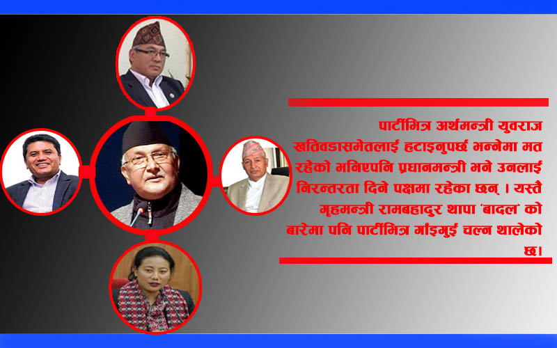 यस्तै कानूनमन्त्री, महिलामन्त्री, खानेपानी मन्त्रीसमेतलाई हटाइने सम्भावना रहेकोछ । पार्टीभित्र अर्थमन्त्री युवराज खतिवडासमेतलाई हटाइनुपर्छ भन्नेमा मत रहेको भनिएपनि प्रधानमन्त्री भने उनलाई निरन्तरता दिने पक्षमा रहेका छन् । यस्तै गृहमन्त्री रामबहादुर थापा बादलको बारेमा पनि पार्टीभित्र गाँइगुइँ चल्न थालेको छ ।