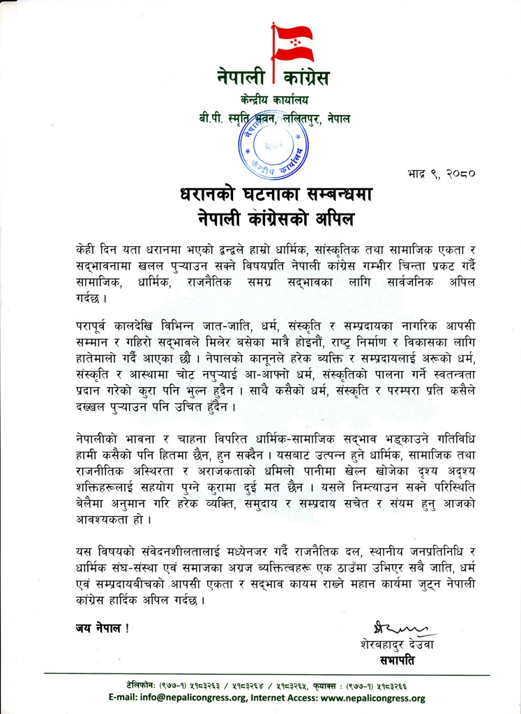सभापति शेरबहादुर देउवाको नाममा जारी विज्ञप्तिमा सामाजिक, धार्मिक, राजनैतिक समग्र सद्भावका लागि सार्वजनिक अपीलसमेत गरिएको छ ।
