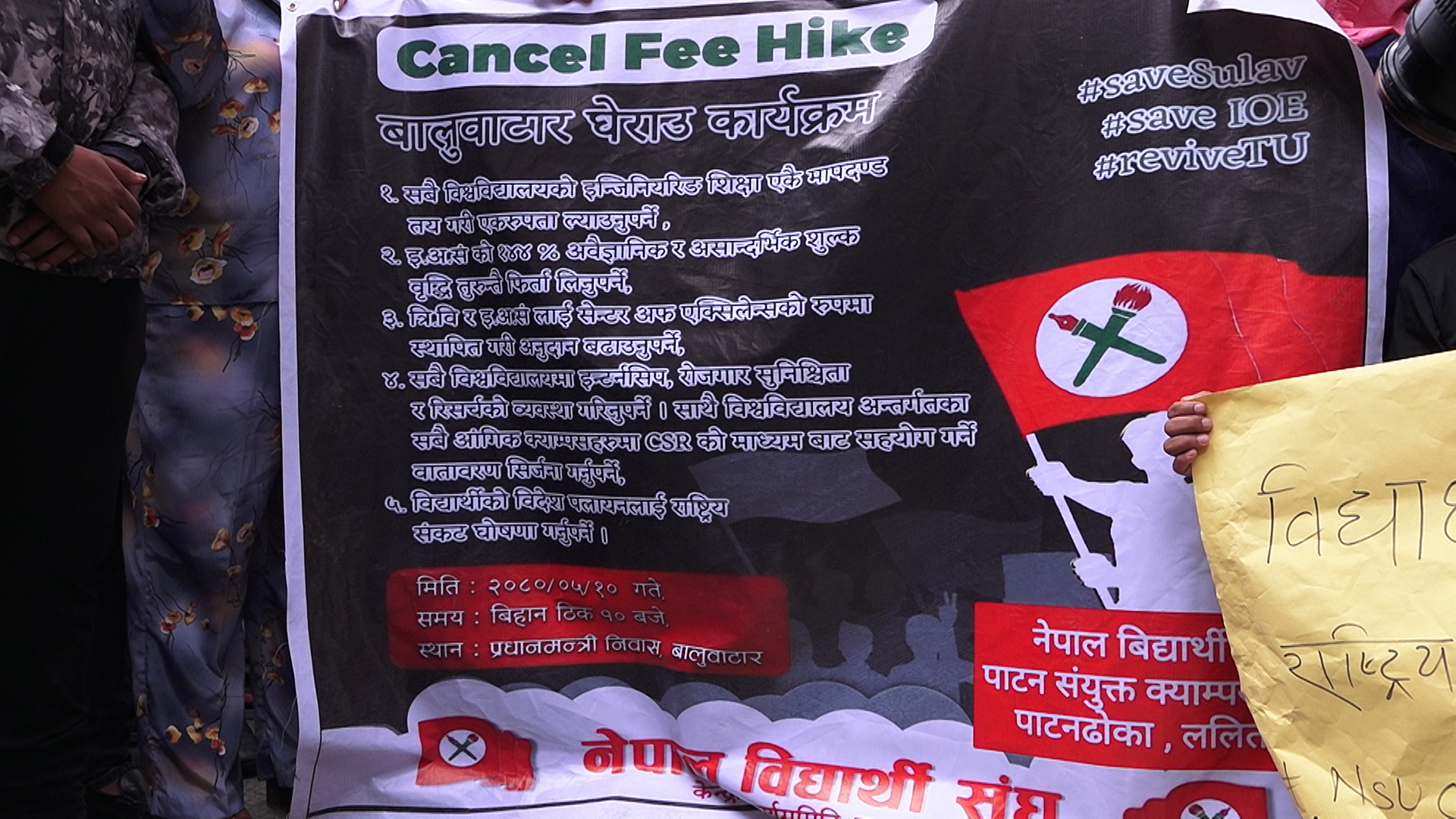 आइतबार नेविसंघ निकट विद्यार्थीहरू पोष्टर र प्लेकार्डसहित नाराबाजी गर्दै बालुवाटारस्थित प्रधानमन्त्रीको सरकारी निवास बालुवाटार घेर्न पुगेका हुन् ।