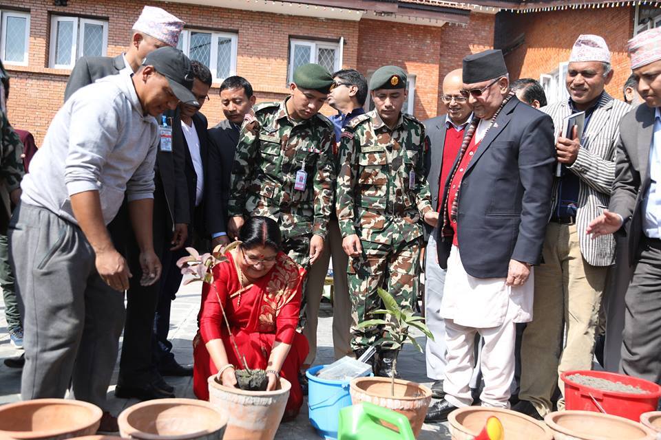 Prime Minister Oli on the occasion was accompanied by his spouse Radhika Shakya, who also planted saplings of guava tree.