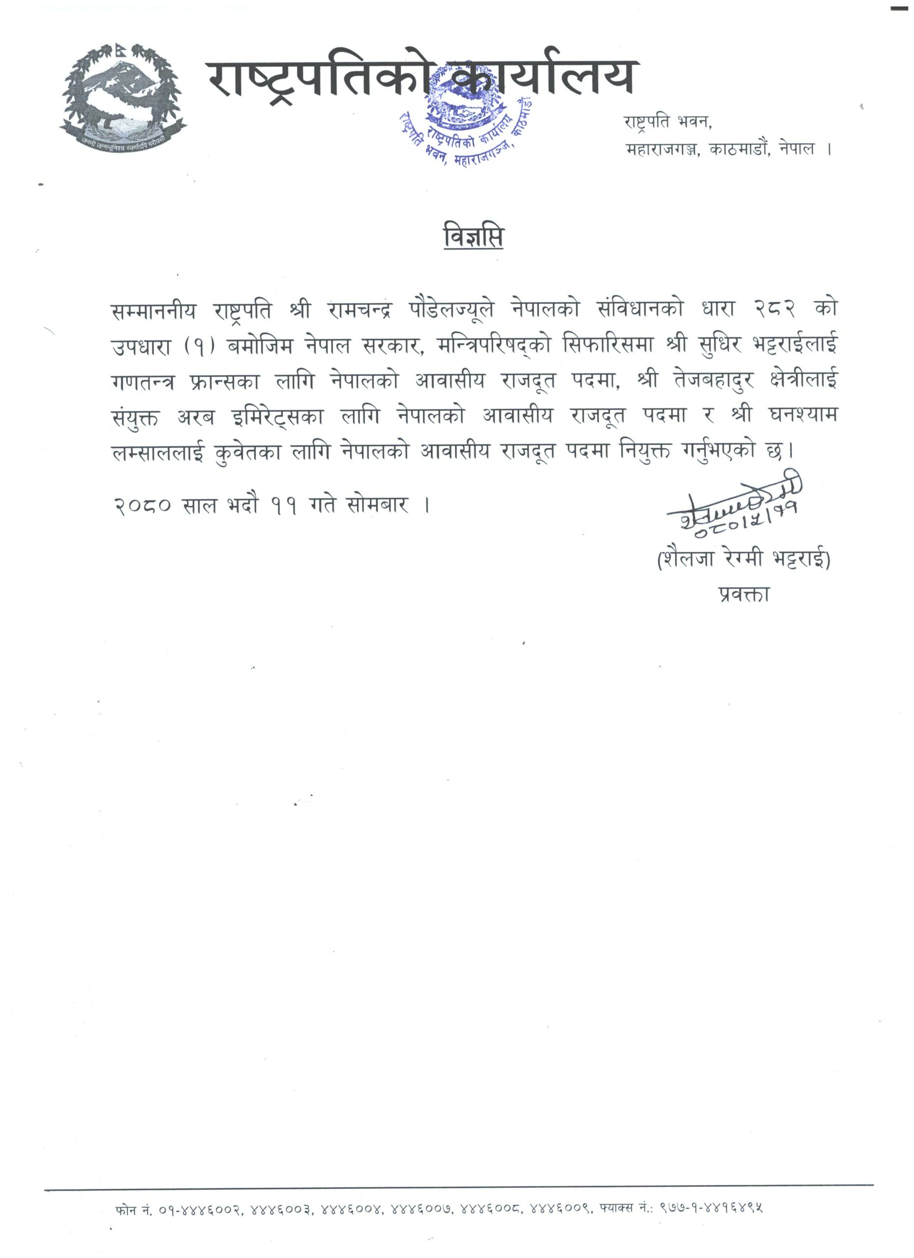 जसअनुसार्, सुघीर भट्टराईलाई गणतन्त्र फ्रान्सका लागि नेपालको आवासीय राजदूतमा,तेजबहादुर क्षेत्रीलाई संयुक्त अरब इमिरेट्सका लागि नेपालको आवासीय राजदूतमा र घनश्याम लम्साललाई कुवेतका लागि नेपालको आवासीय राजदूत पदमा नियुक्त गरिएको राष्ट्रपतिको कार्यालयद्वारा जारी विज्ञप्तिमा जनाइएको छ ।