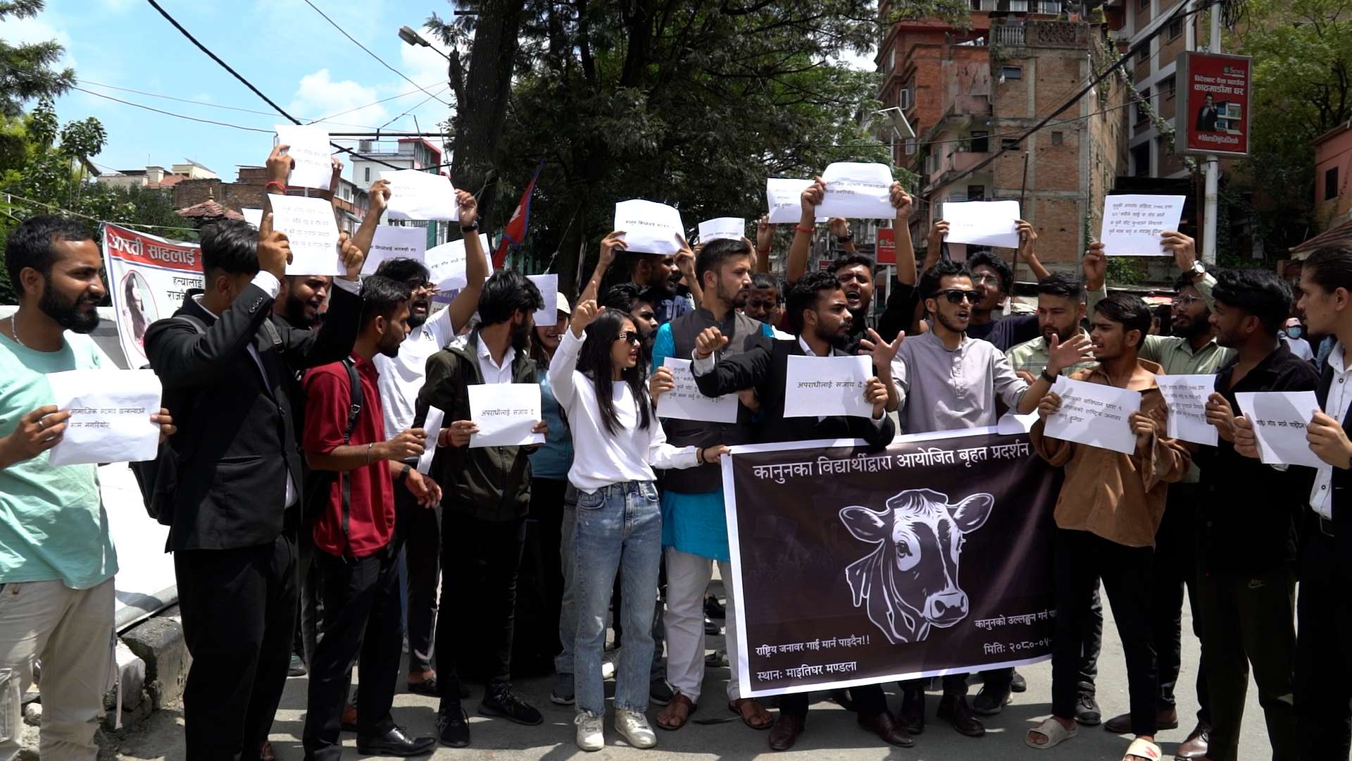 काठमाडौं । कानुनका विद्यार्थीहरूले राष्ट्रिय जनावर, गाई मार्नेलाई कारबाहीको माग राख्दै काठमाडौंमा प्रर्दशन गरेका छन् ।