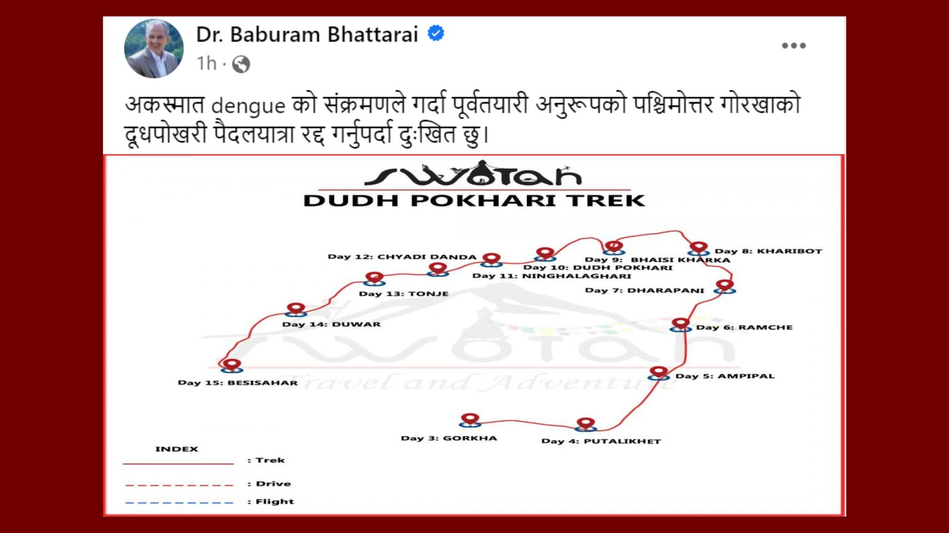 उनले लेखेका छन्,‘अकस्मात डेंगीको संक्रमणले गर्दा पूर्वतयारी अनुरूपको पश्चिमोत्तर गोरखाको दूधपोखरी पैदलयात्रा रद्द गर्नुपर्दा दुःखित छु ।’