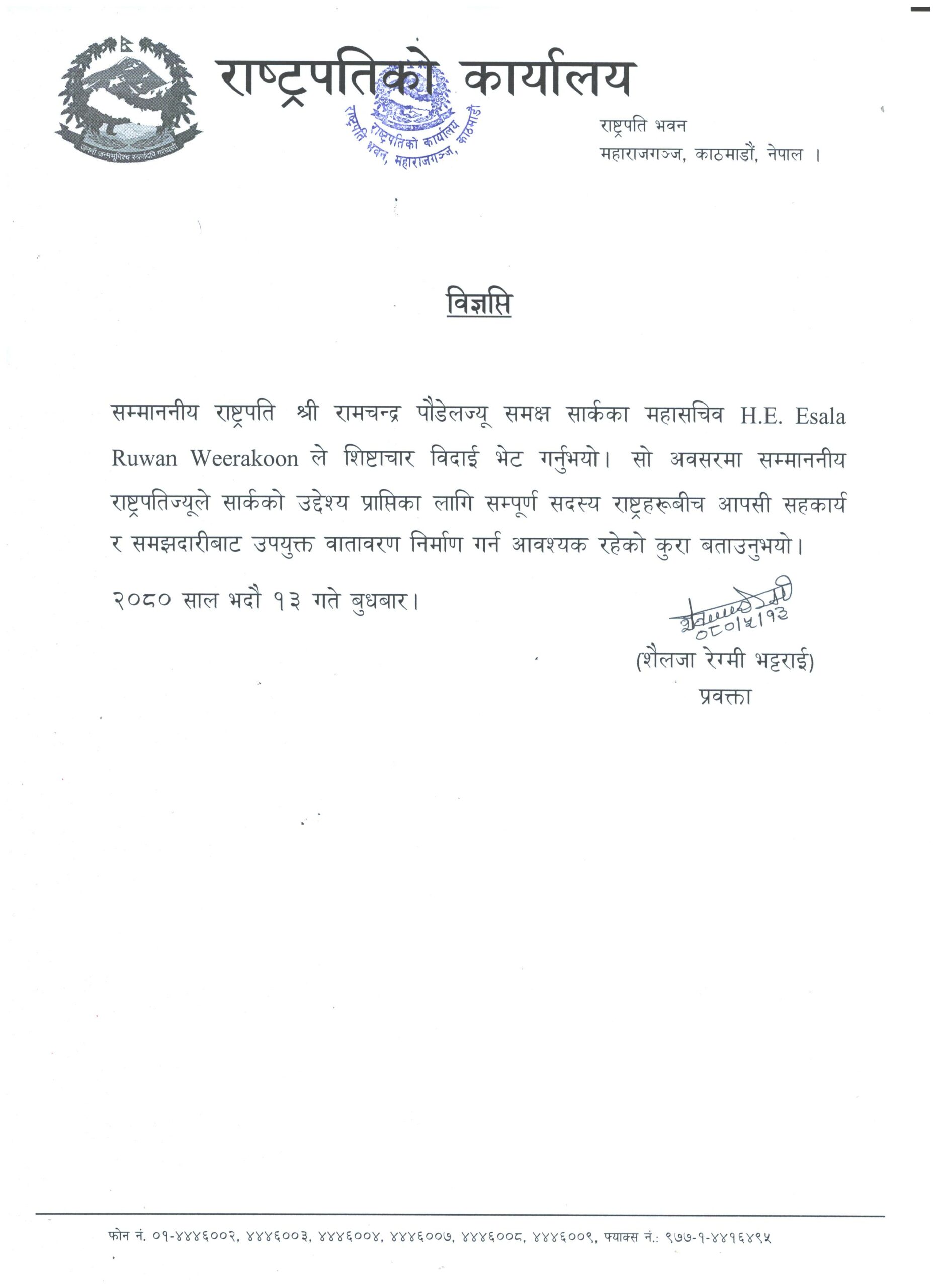 बुधबार राष्ट्रपति भवन शीतल निवासमा भएको भेटमा पौडेलले सार्कको उद्देश्य प्राप्तिका लागि सम्पूर्ण सदस्य राष्ट्रहरुबीच सहकार्य र समझदारी आवश्यक रहेको बताए । समझदारीबाट नै सदस्य राष्ट्रहरुबीच उपयुक्त वातावरण बन्ने विश्वास पनि राष्ट्रपति पौडेलले व्यक्त गरे ।