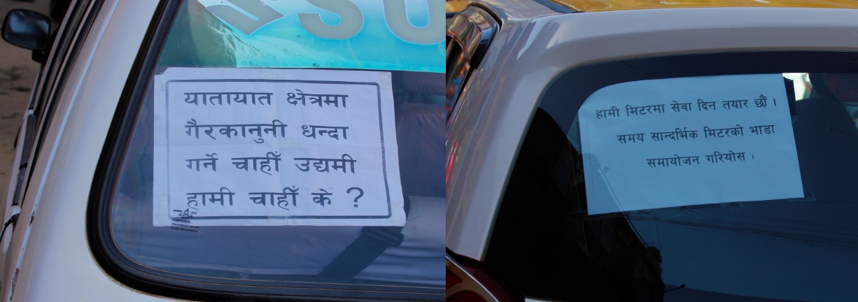‘सरकार मैले २०७५ सालको मूल्यमा खरिद गर्नुपर्ने तर, मैले सेवा दिदा चाहीँ २०६९ को मूल्यमा दिनु पर्ने के यो न्यायोचित हो र ? हामी मिटरमा सेवा दिन तयार छौँ । समय सान्दर्भिक मिटरको भाडा समायोजन गरियोस । यातायात क्षेत्रमा गैरकानुनी धन्दा गर्ने चाहीँ उद्यमी हामी चाहीँ के ?’ जस्ता नाराहरु लेखिएको पर्चा टाँसेर उनीहरुले विरोध गर्दै आइरहेका छन् ।