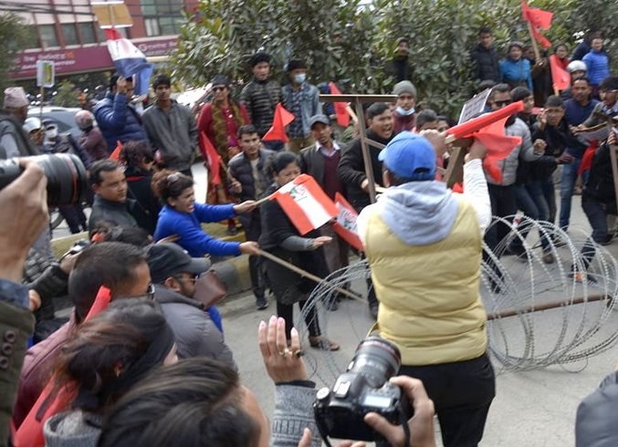 काठमाडौं–कांग्रेस केन्द्रीय कार्यालयको परिसरमै आइतबार भ्रातृ संस्था नेविसंघको दुई खेमाका नेता–कार्यकर्ता आपसमै भिडे । झगडा साम्य पार्न प्रहरी आएर लाठीचार्ज गर्नुप–यो । तर, केन्द्रीय समिति बैठक बस्ने तयारीमा रहेका माउ पार्टीका नेताहरू दोस्रो तलाबाट रमिता हेरेर मात्रै बसे । झगडा मिलाउन आँगनमा झर्ने आँटसमेत गरेनन् ।