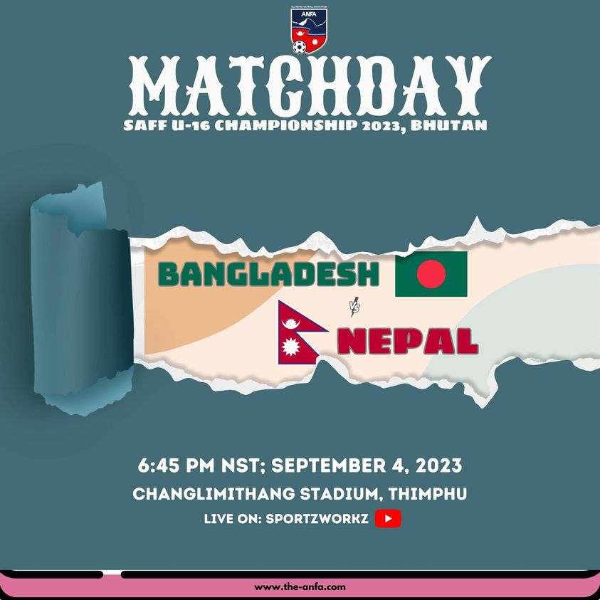 समूह ए मा रहेको नेपाल र बंगलादेशबीतको खेल थिम्पुस्थित चाङलिमियाथाङ स्टेडियममा नेपाली समय अनुसार बेलुका पौने ७ बजे सुरु हुनेछ ।