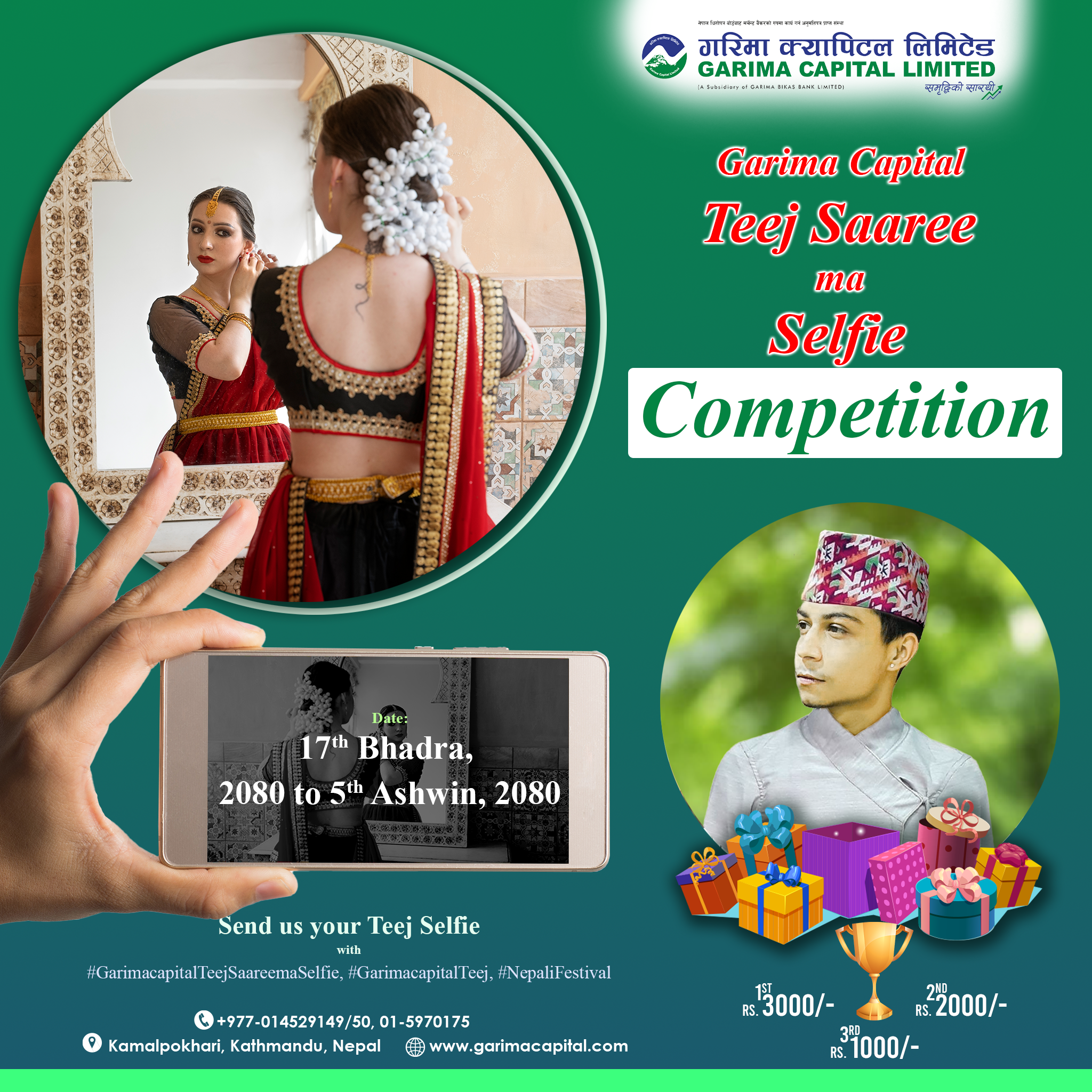 तीज महोत्सव भव्यताका साथ मनाउने उद्देश्यले नेपाली दाजुभाइ तथा दिदिबहिनीहरूका लागि भाद्र १७ गते देखि आश्विन ०५ गतेसम्मका लागि “गरिमा क्यापिटल तीज सारीमा सेल्फी प्रतियोगिता” आयोजना गर्न लागेको कम्पनीको भनाई छ । सेल्फी प्रतियोगितामा इच्छुक सम्पूर्ण व्यक्तिहरुले भाग लिन पाउने छन भने सहभागीहरुले परम्परागत पोशाकमा लिएको आफ्नो फोटो गरिमा क्यापिटल लिमिटेडको आधिकारिक फेसबुक पेजमा पोष्ट गर्नुपर्नेछ ।