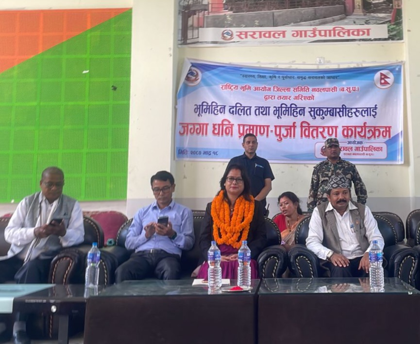 भूमि व्यवस्था, सहकारी तथा गरिबी निवारण मन्त्री रन्जिता श्रेष्ठ चौधरीले सरावल गाउँपालिका वडा नं ३ का २५ भूमिहीन सुकुम्वासी परिवारलाई जग्गाधनी लालपुर्जा प्रदान गरिन् । लामो समयको प्रतीक्षा पछि नवलपरासीको (पश्चिम) सराबल गाउँपालिकाका २५ परिवारले पुर्जा पाएका हुन।