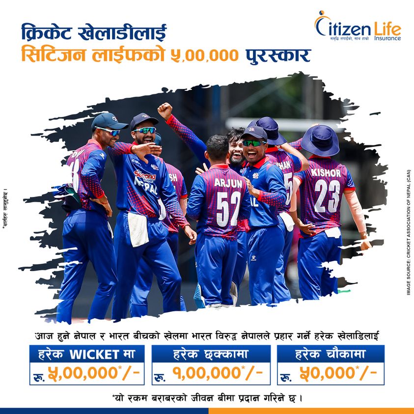 काठमाडौं । सिटिजन्स लाइफ इन्स्योरन्स कम्पनीले भारतीय ब्याट्सम्यानको विकेट लिने खेलाडीलाई प्रति विकेट ५ लाख रुपैयाँ दिने घोषणा गरेको छ ।