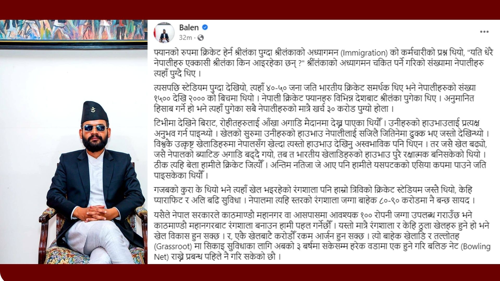 उनले लेखेका छन् ,‘नेपाल सरकारले काठमाडौं महानगर वा आसपासमा आवश्यक १०० रोपनी जग्गा उपलब्ध गराउँछ भने काठमाडौं महानगरबाट रंगशाला बनाउन हामी पहल गर्नेछौँ । यस्तो मात्रै रंगशाला र केही ठूला खेलहरू हुने हो भने खेल विकास हुन सक्छ। र, एकै खेलबाटै करोडौं रकम आर्जन हुन सक्छ । त्योबाहेक खेलाडी र तल्लो तहमा सिकाइ सुविधाका लागि अबको ३ वर्षमा सकेसम्म हरेक वडामा एक हुनेगरी बलिङ नेट राख्ने प्रबन्ध पहिले नै गरिसकेका छौँ ।’