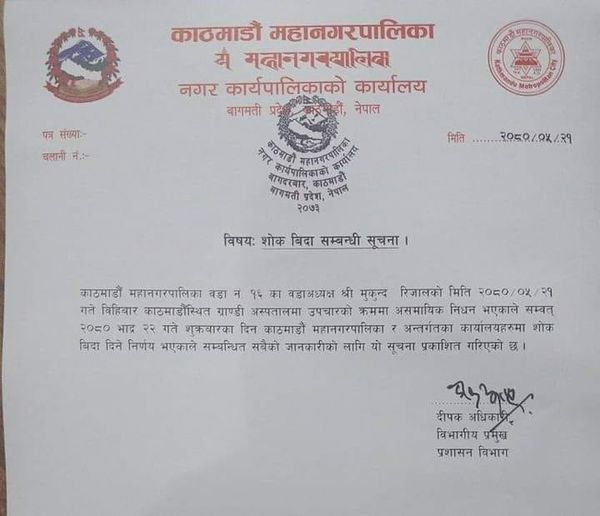 महानगरका विभागीय प्रमुख दिपक अधिकारीले विज्ञप्ति जारी गर्दै भदौ २२ गते शुक्रबार महानगरभर शोक बिदा दिएको हो ।
