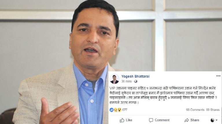 उनेले सामाजिक संञ्जाल फेसबुकमा लेखेका छन् “भिआइपी उडानमा पाइलटसहित ५ जनाभन्दा बढी पाथिभरामा उडान गर्न मिल्दैन भनेर केहीलाई सुकेटार वा ताप्लेजुङ बजार मै झारेरमात्र पाथिभरा उडान गर्दै आएका छन् पाइलटहरुले ।
