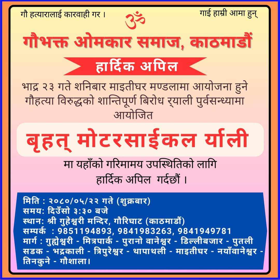 काठमाडौं । गौहत्याको विरोधमा काठमाडौंमा सनातन धर्मावलम्बीहरू र हिन्दुवादी संगठनहरूले विरोध स्वरूप विशाल मोटरसाइकल र्‍याली गर्ने भएका छन् ।