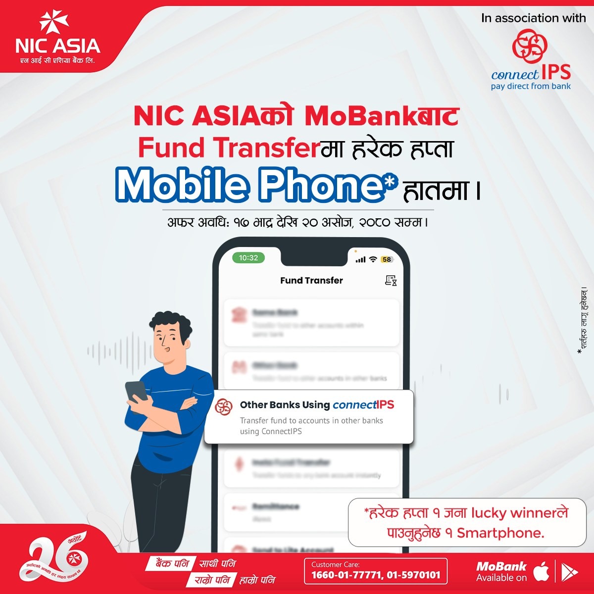काठमाडौं । डिजिटल बैंकिङ्गमा मुलुकको अग्रणी स्थानमा रही सहज बैंकिङ्ग सेवा तथा सुविधा प्रदान गर्दै आइरहेको यस एन आई सी एशिया बैंकले कनेक्ट आइपीएससँँगको सहकार्यमा आफ्ना मोवाइल बैंकिङ्ग ग्राहकका लागि ‘फन्ड ट्रान्सफरमा हरेक हप्ता: मोबाइल फोन हातमा’ अफर सार्वजनिक गरेको छ ।