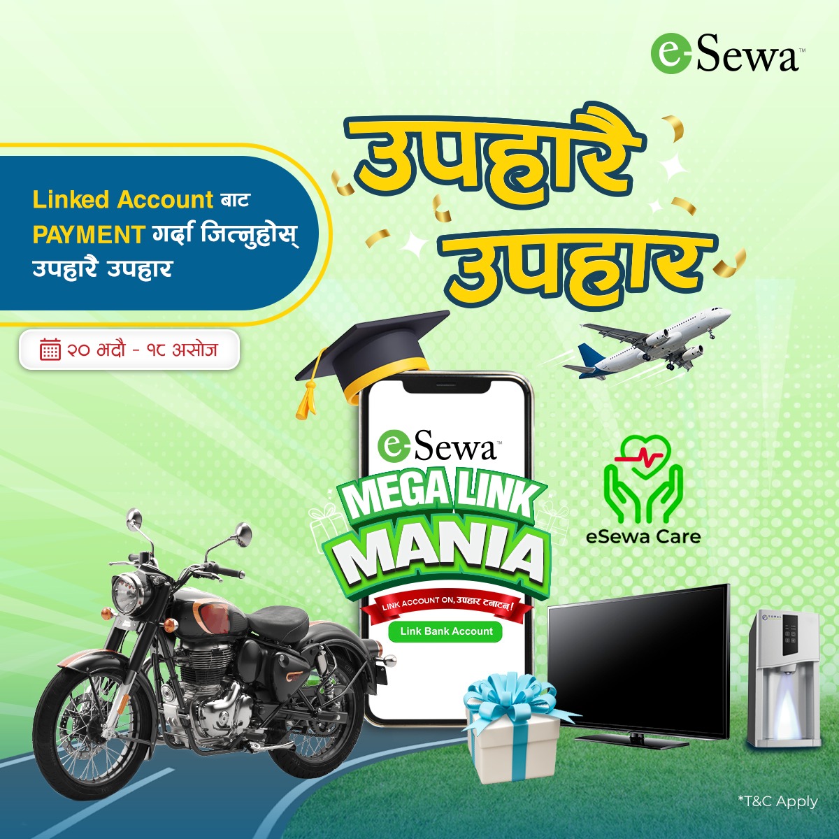 इसेवा एकाउन्टमा लिंक गरिएको बैंक खाता मार्फत भुक्तानी गर्दा दैनिक, साप्ताहिक र मासिक आधारमा आकर्षक पुरस्कार जित्न सकिने अफर सार्बजनिक गरिएको हो ।