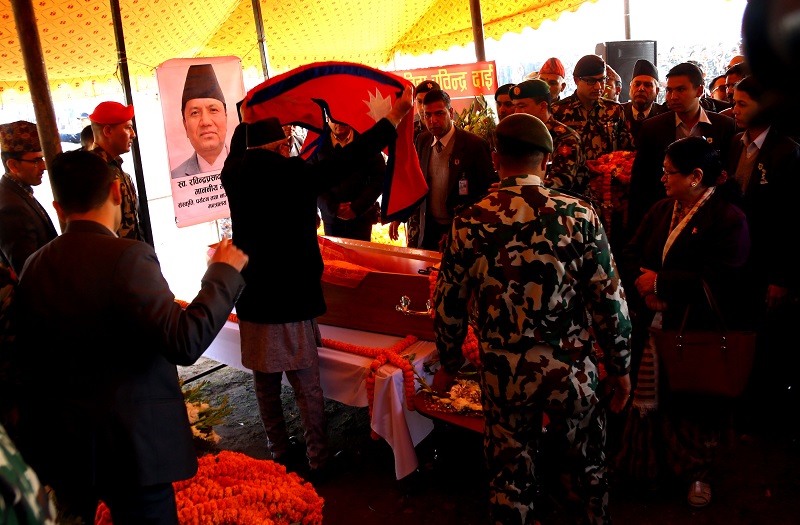 शुक्रवार बिहान टुँडिखेलमा आयोजित अन्तिम श्रद्धाञ्जली कार्यक्रममा प्रधानमन्त्री ओलीले राष्ट्रिय झण्डा ओढाएर श्रद्धाञ्जली व्यक्त गरेका हुन् ।