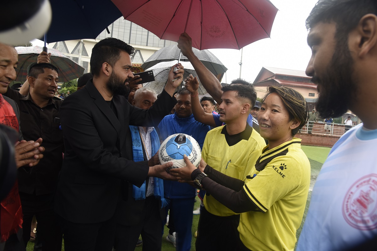 काठमाडौं । काठमाडौं महानगरपालिकाका प्रमुख बालेन्द्र शाह (बालेन) ले आज लैनचौर फुटसल मैदानमा ‘प्रयागराज सिंह सुवाल स्मृति फुटसल प्रतियोगिता’ रेफ्रीलाई फुटबल दिएर शुभारम्भ गरेका छन् ।