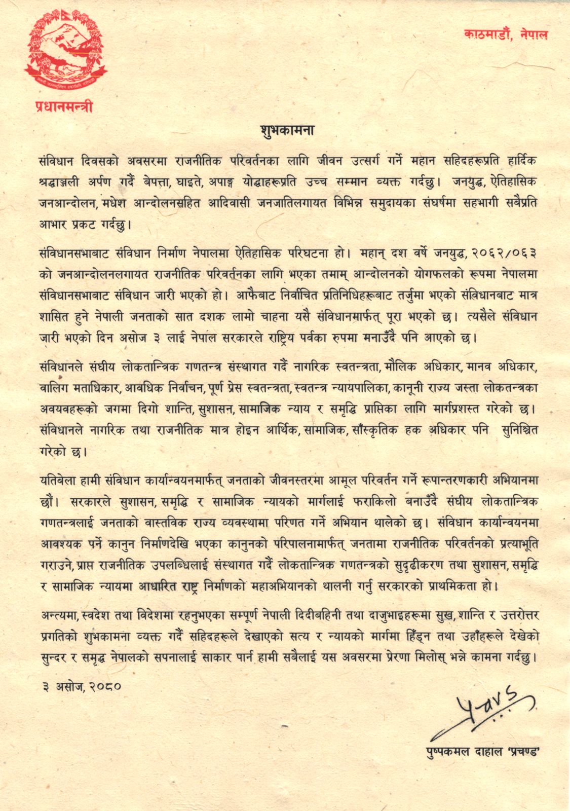 बुधबार संविधान दिवसको अवसरमा एक शुभकामना सन्देश जारी गर्दै दाहालले स्वदेश तथा विदेशमा रहेका सम्पूर्ण नेपाली दिदी–बहिनी तथा दाजुभाइहरूमा सुख, शान्ति र उत्तरोत्तर प्रगतिको कामना गर्दै शुभकामना दिएका छन् । उनले सरकारले संविधान कार्यान्वयन मार्फत् सुशासन, समृद्धि र सामाजिक न्यायको मार्गलाई फराकिलो बनाउँदै संघीय लोकतान्त्रिक गणतन्त्रलाई जनताको वास्तविक राज्य व्यवस्थामा परिणत गर्ने अभियान थालेको सन्देशमा भनेका छन् ।