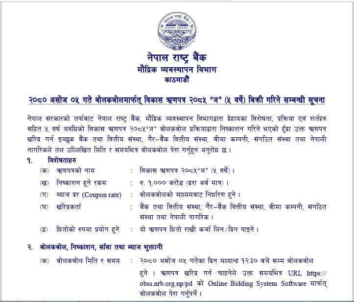 सो दिन पाँच बर्षे अवधिको विकास ऋणपत्र २०८५“ञ” (५ वर्षे) बोल कबोलको माध्यमद्धारा बिक्री गर्न लागिएको राष्ट्र बैंकको भनाई छ ।