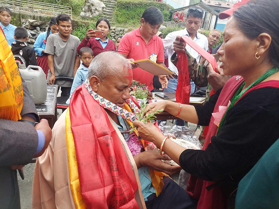 वडाध्यक्ष अमर छन्त्याल, विद्यालय व्यवस्थापन समितिका अध्यक्ष दलमान छन्त्याललगायत विद्यालयका विद्यार्थी, शिक्षक, अभिभावकसहित सिङ्गो गाउँवासीले उहाँलाई दोसल्ला, सम्मान पत्र, कदरपत्रसहित अभिनन्दन गर्दै चरेसका थाल उपहार दिएका थिए ।