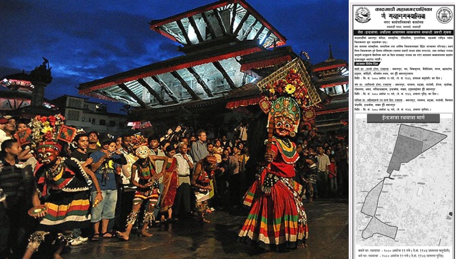 काठमाडौं । काठमाडौं महानगरपालिकाले इन्द्रजात्रामा काठमाडौंका विभिन्न ठाउँको सवारी आवागमन प्रभावित हुने भएकाले वैकल्पिक बाटो प्रयोग गर्न आग्रह गरेको छ । मंगलबार विज्ञप्ति सार्वजनिक गर्दै सवारी आवागमन प्रभावित हुने भएकाले वैकल्पिक बाटो प्रयोग गर्न आग्रह गरिएको हो ।